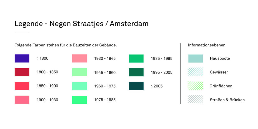 Durch die vielen historischen Häuser hat Amsterdam einen einmaligen Charme und wirkt wie ein Freiluftmuseum. Viele der Häuser wurden bereits vor 1800 erbaut. Bei den Darstellungen werden die Gebäude und deren Erbauungszeitraum gezeigt.